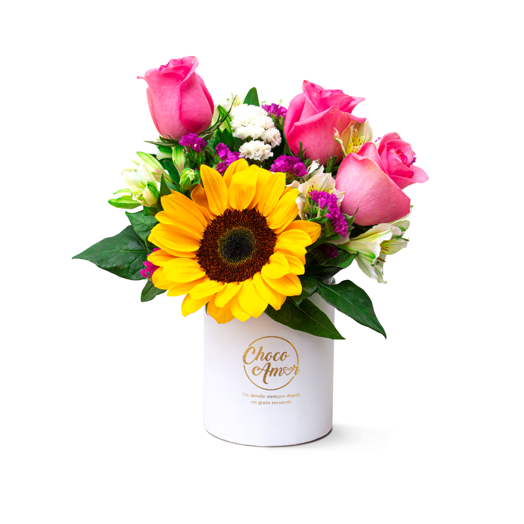 - Arreglo de girasol, 03 rosas, flores de complemento y follaje de estación.