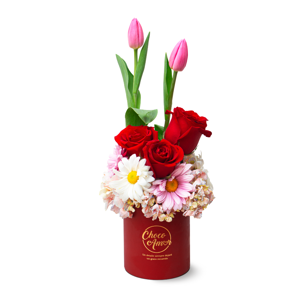 - Arreglo de 02 tulipanes, 03 rosas con margaritas, flores complementarias y follaje de estación (colores de tulipanes y rosas a pedido del cliente).