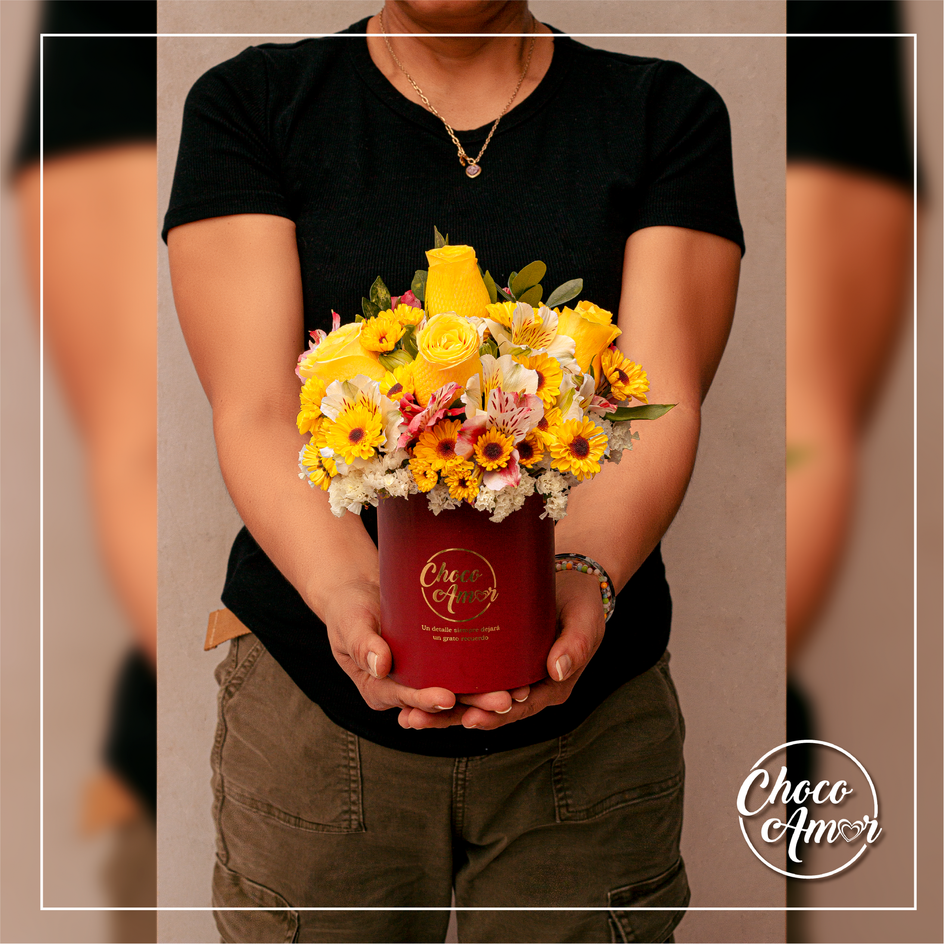 - Arreglo de 04 rosas, astromelias, margaritas y follaje de estación.