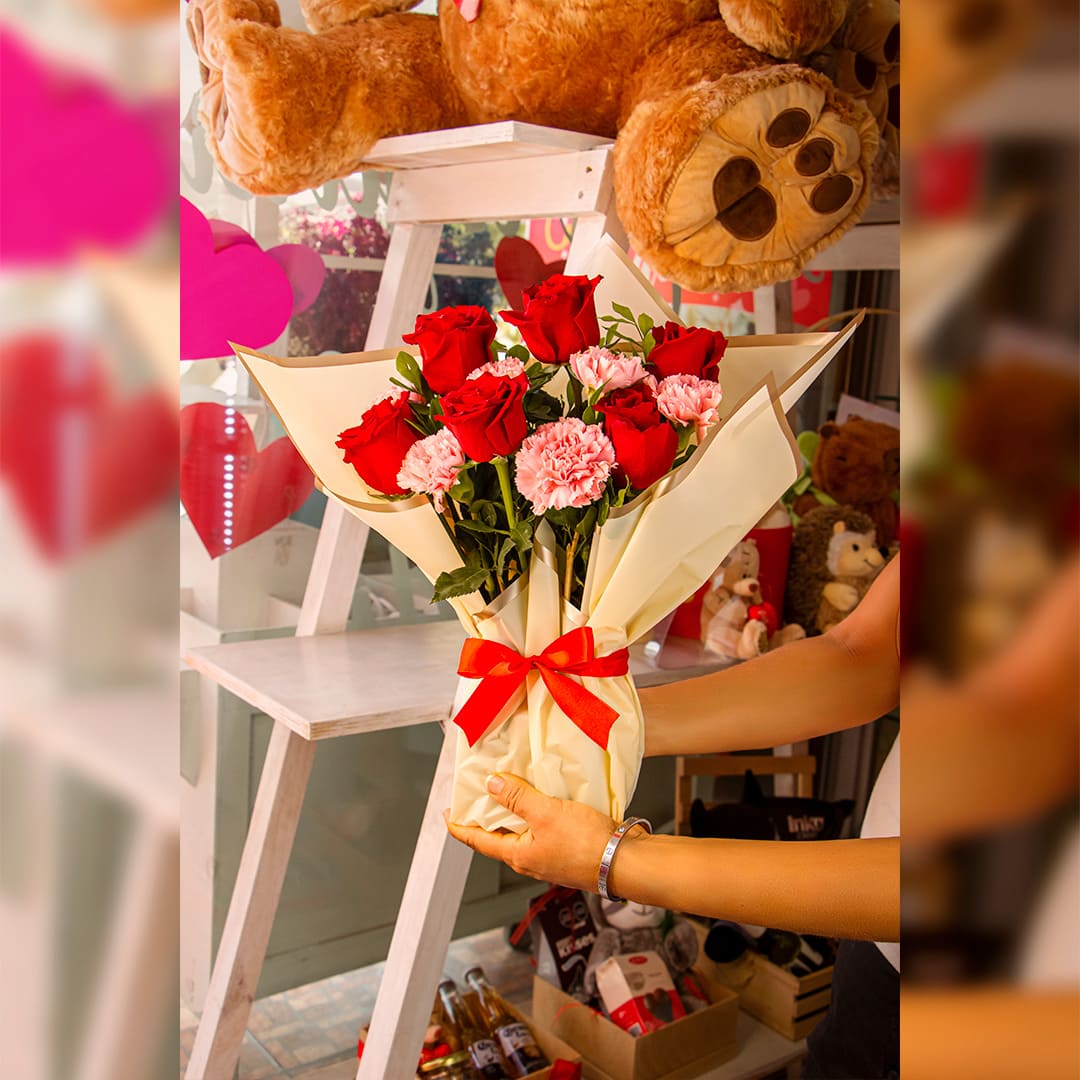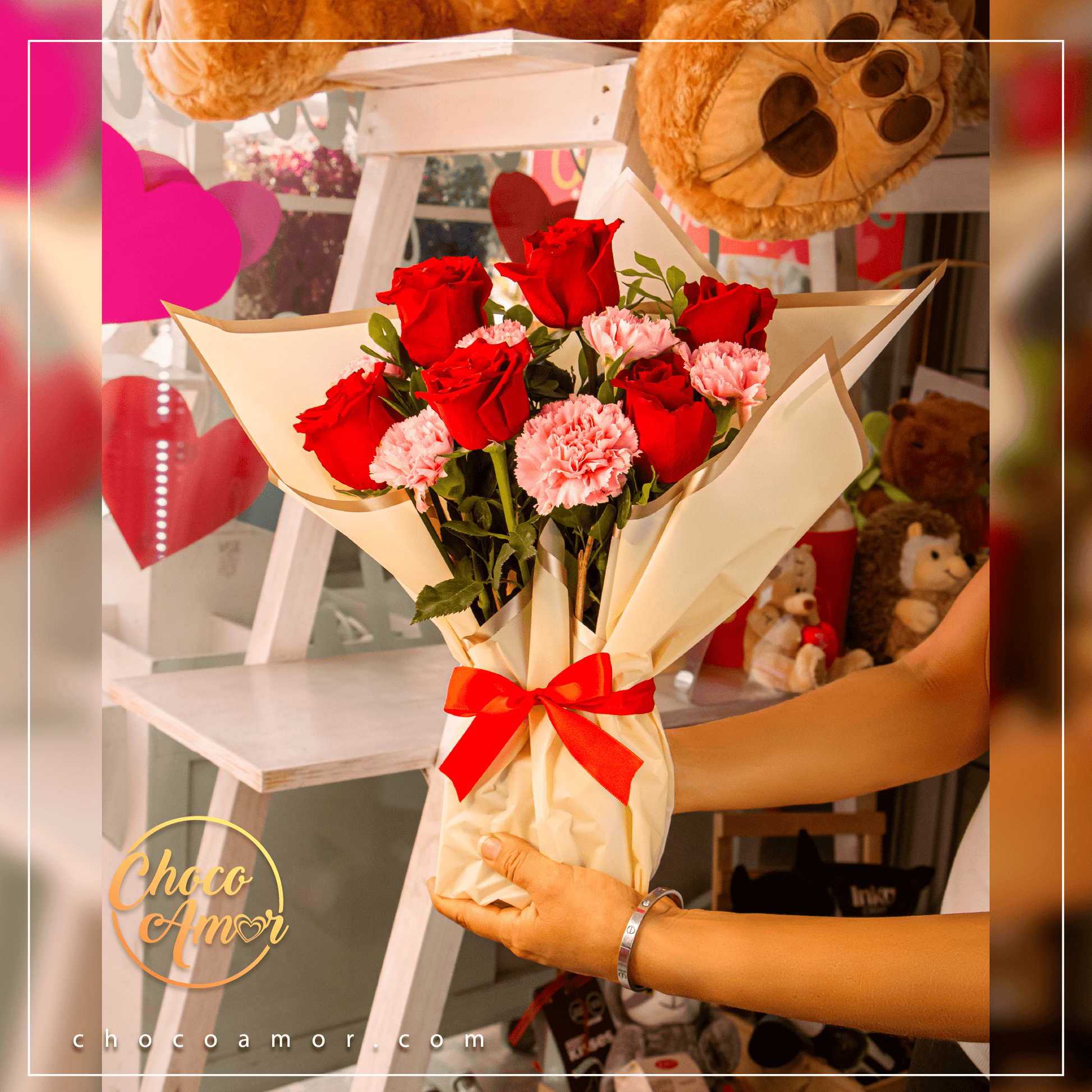 - Arreglo de rosas, claveles importados y follaje de estación.- Lazo y mariposa decorativo.