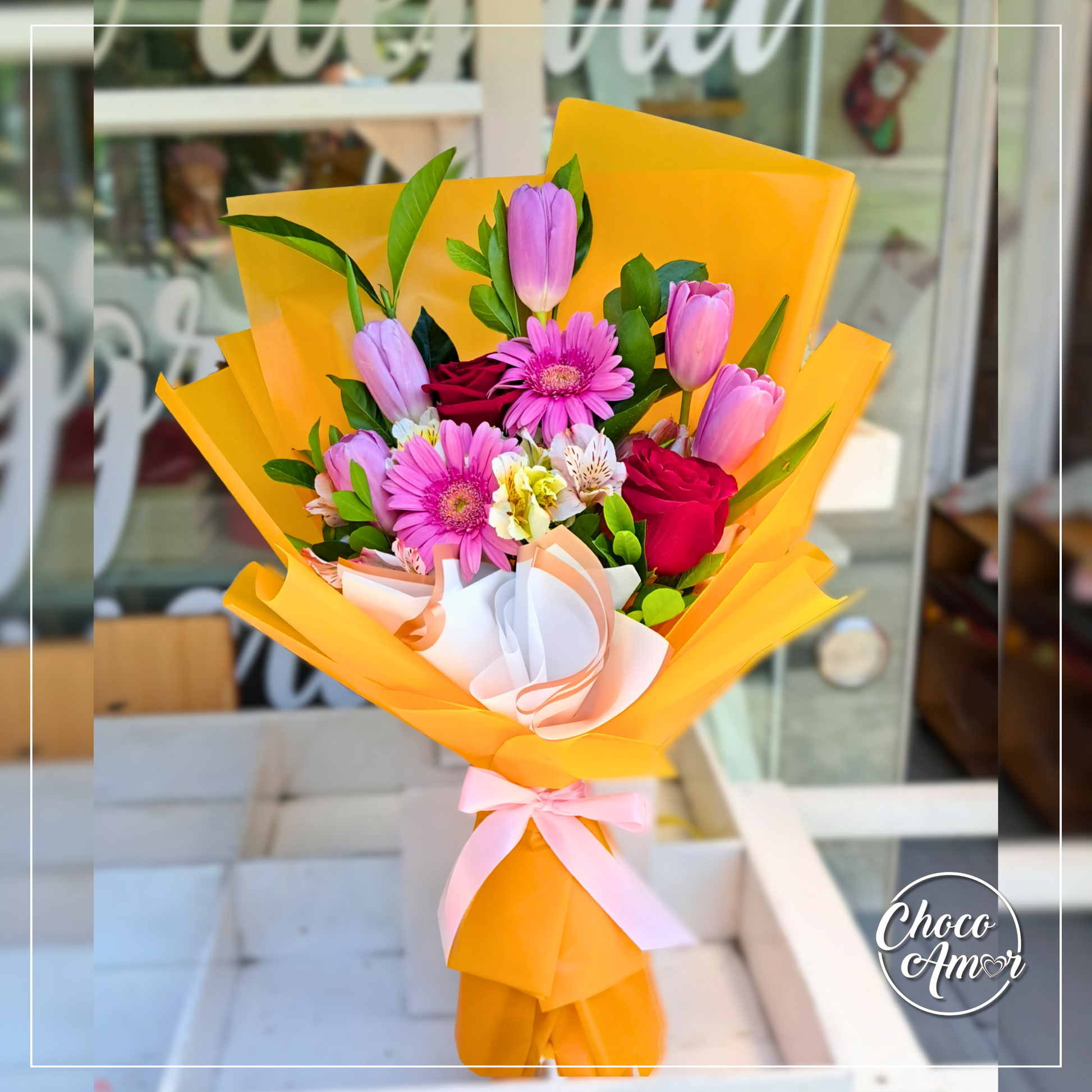 - Arreglo de 5 tulipanes, astromelias, gerberas y rosas a combinación.