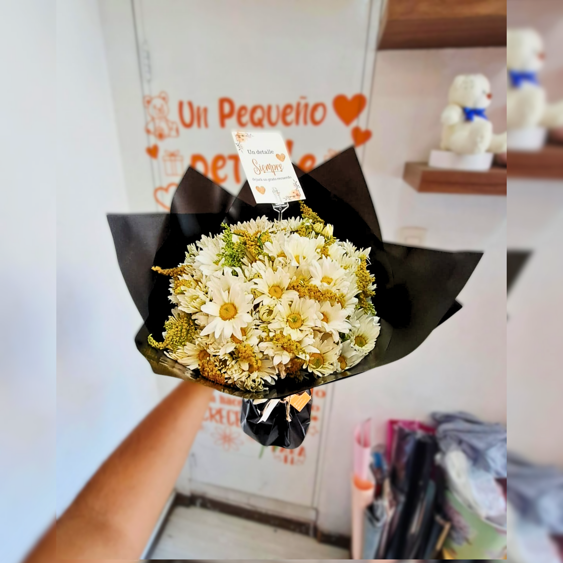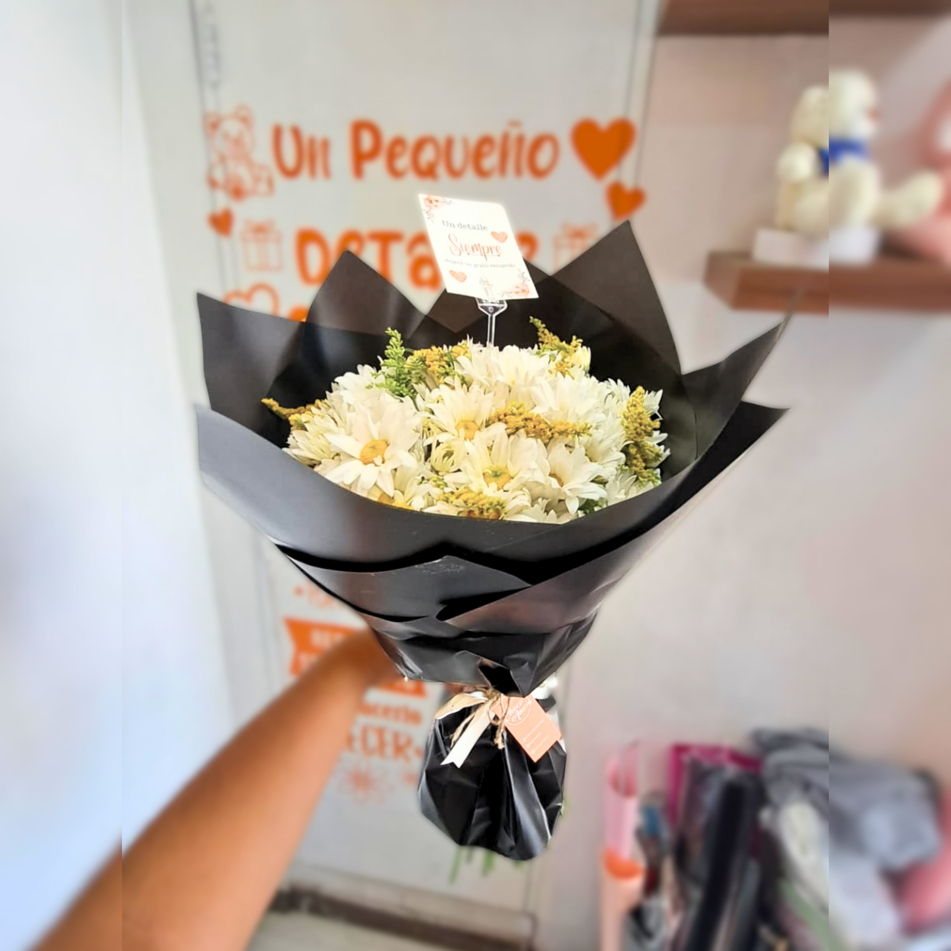 - Arreglo de margaritas y follaje de estación.